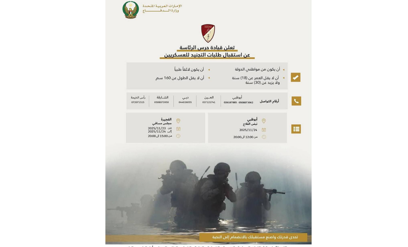 أعلنت وزارة الدفاع في دولة الإمارات العربية المتحدة عن فتح باب التجنيد للعسكريين لدى قيادة حرس الرئاسة، وذلك وفق شروط محددة ومواعيد رسمية لاستقبال الطلبات في عدد من إمارات الدولة.