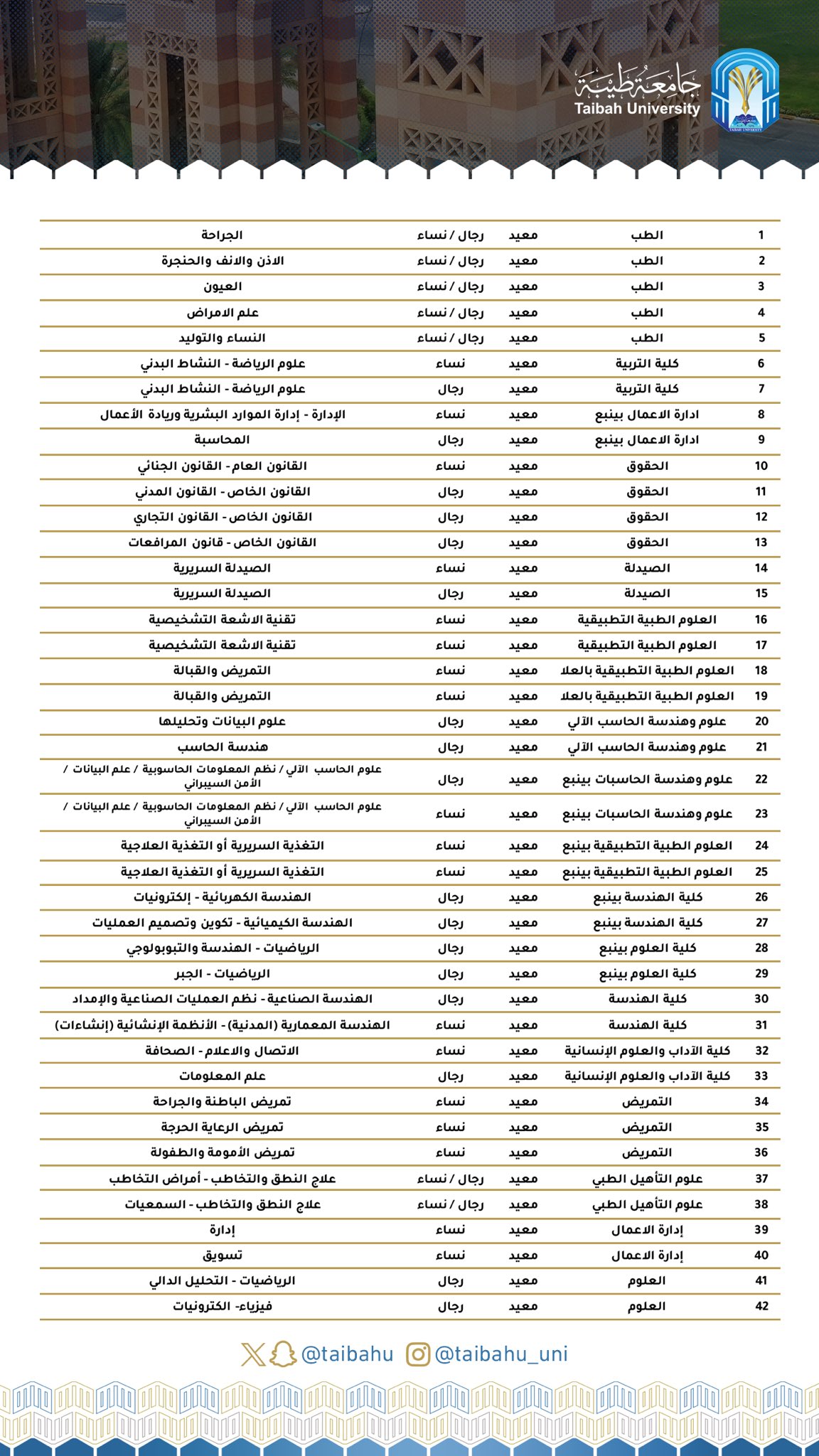 ننشر لكم من خلال موقعنا خليجى دوت كوم إعلان وظائف جامعة طيبة 1445 للرجال والنساء لحملة البكالوريوس في (36 تخصص) ، للعمل بالمسميات الوظيفية التالية.